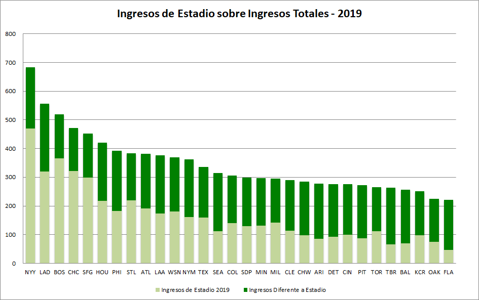 Boston ingresó $366 millones por «estadio» de los $519 millones totales que generaron en 2019, esto es un 70.52% de su flujo. Sus ingresos sin estadio serían de unos $153 millones, mientras que sus costos operativos reducidos en un 30%, incluyendo salarios prorrateados menos 40%, llegarían a $238 millones, por lo que presentarían balance negativo de alrededor -$85 millones al final del año. Mientras que un equipo como Tampa Bay, con bajísima asistencia histórica, con una nómina de menos de $70 millones y con la mitad de los gastos administrativos y operativos que tienen los Red Sox, podría tener una ganancia operativa de $80 millones, incluso mayor que la del año pasado pues acaba de firmar un nuevo acuerdo de TV regional que les hará ganar $48 millones por temporada.