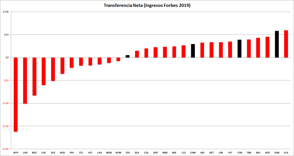 Tomando como referencia los ingresos reportados por Forbes en 2019 y según nuestros cálculos del Revenue Sharing Plan, el fondo transferido de los equipos «pagadores» a los equipos «recibidores» sería de unos $584 millones de dólares; teniendo como principales contribuyentes a los Yankees ($162M), Dodgers ($101M), Red Sox ($83M), Cubs ($60M) y Giants ($51M); y como principales beneficiarios a los Marlins ($59M), Royals ($46M), Orioles ($43M), Rays ($39M) y Pirates ($35M).