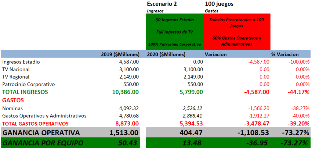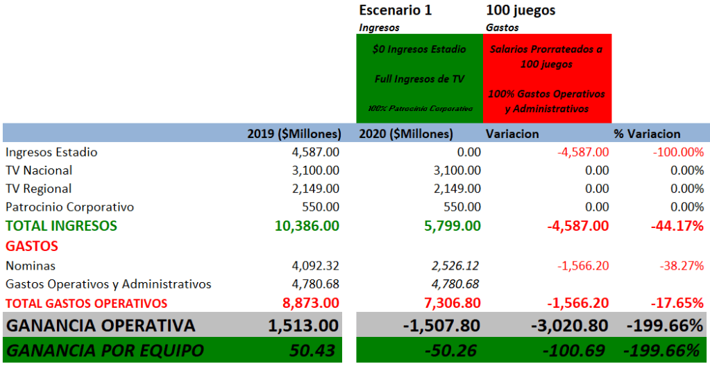 En un primer escenario, donde se jueguen hasta 100 juegos de Temporada Regular sin que se genere ni un céntimo de dólar por venta de tickets, por operación de las tiendas del equipo o por las concesiones habilitadas para trabajar en el parque pero manteniendo los ingresos de TV tanto Nacional como Regional y patrocinios corporativos intactos tal como en 2019 ; los ingresos totales de la liga en 2020 serían de unos $5.8 Billones.