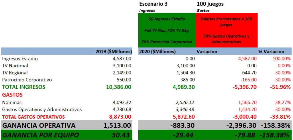 Entonces, veamos un escenario donde los ingresos de TV Regional y Patrocinios se reduzcan en un 30%, la TV Nacional se mantenga en 100%, los salarios sean prorrateados y el resto de costos se reduzcan otro 30%. Aquí la liga trabajaría a pérdida de casi 900 millones de dólares, casi $30 millones de pérdida operativa por equipo. Escenario totalmente inviable.