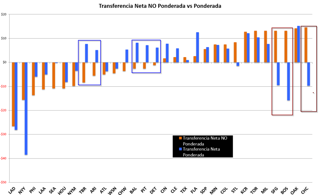 Con este método, los usuales «Pagadores» seguirían aportando al fondo (Yankees, Dodgers, Cubs, Red Sox) y los usuales «Recibidores» serían aún los beneficiarios (Rays, Pirates, Marlins), pero esto presenta un problema todavía mayor. Los Cubs por ejemplo tendrían que pagar al fondo $10 Millones de dólares en lugar de recibir $15 Millones, a pesar de que cerrarían con el Ingreso Local más bajo de la Liga en 2020 y cerrarían con pérdidas operativas después del Revenue Sharing de casi $82 millones. Pirates, por su parte, que deberían contribuir con $8 millones al Plan, terminarían recibiendo otros $10 millones bajo el sistema Ponderado, finalizando con ganancias de $52MM luego de repartición.