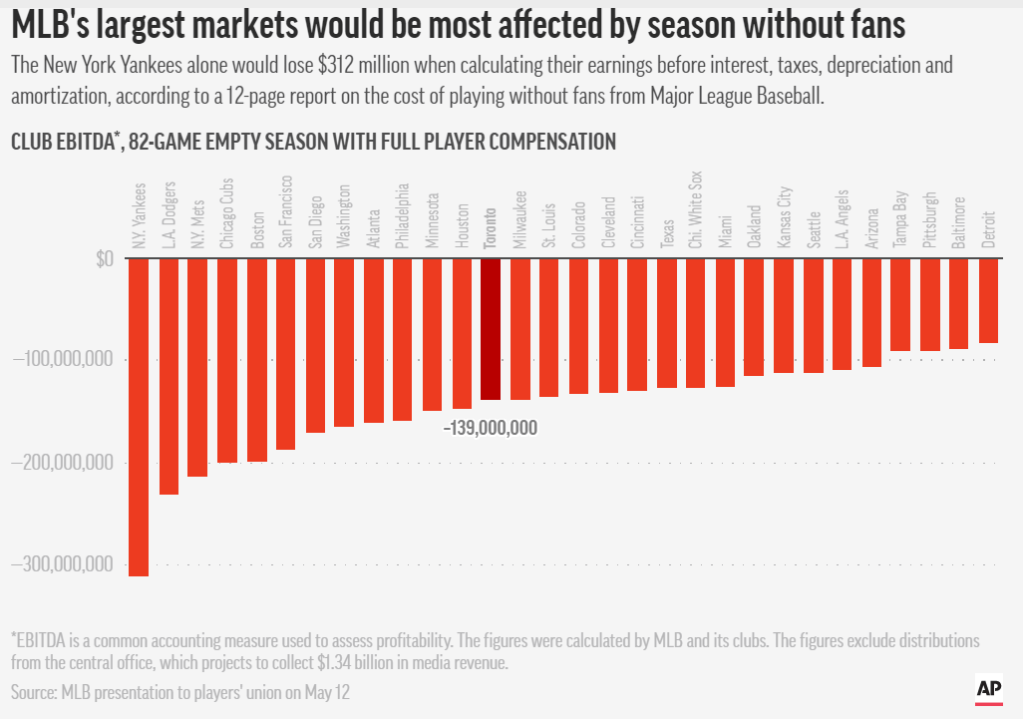 El estudio mostraba cómo ciertos equipos como los Yankees, Red Sox, Dodgers, Giants y Cubs sufrirían pérdidas de entre $188 millones (en el caso de Boston) y $312 millones (para los Yankees). Mientras que equipos como Detroit ($84 millones), Baltimore ($90 millones), Tampa Bay o Pittsburgh (ambos $91 millones) también tendrían estados deficitarios al final del año pero en menor proporción.