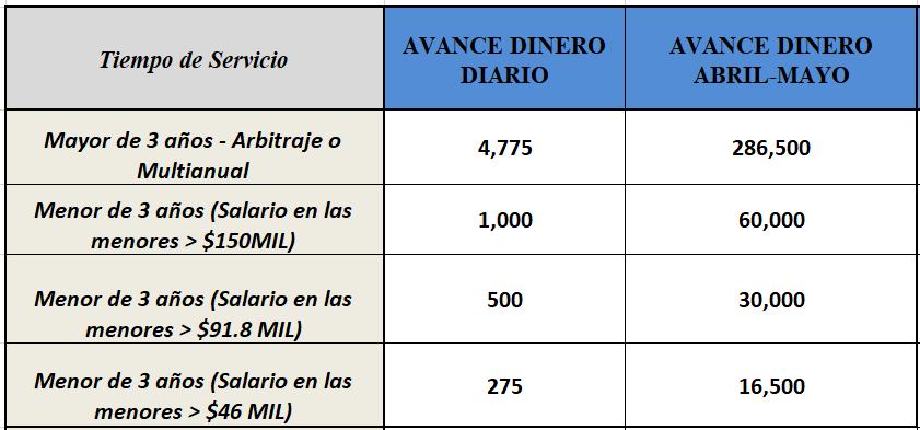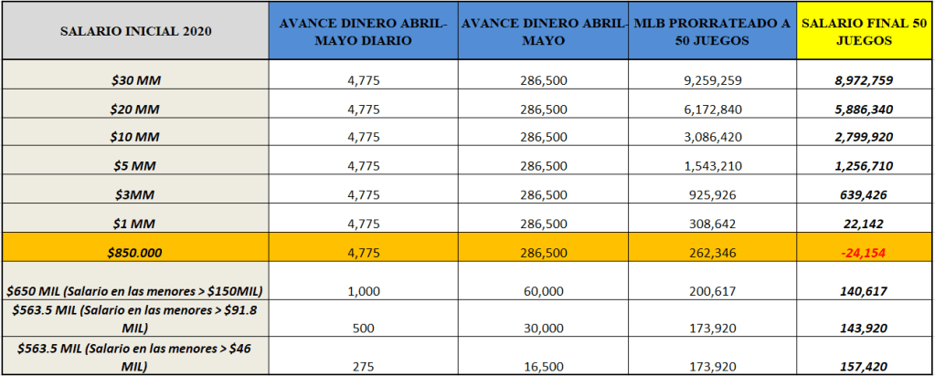El pago de este avance sería realizado a escala y dependiendo del Tiempo de Servicio del jugador en la Liga. Un jugador con 0 a 3 años de servicio y aún con contrato dividido (salario prorrateado por tiempo activo en categorías menores y por período activo en el equipo grande), recibiría $275 dólares diarios ($16.500 por dos meses) si su salario en las menores se ubicaba entre $46.000 y $91.799,99, $500 diarios si su sueldo estaba en el rango de $91.800 y $149.499,99 y $1.000 al día si su salario en liga menores es mayor a $150.000; a este último grupo pertenecen jugadores de la talla de Gleyber Torres o Pete Alonso. Por su parte, aquellos peloteros veteranos con contratos garantizados y en periodo de arbitraje o superior, recibirían $4.775 diarios ($286.500 en dos meses) en caso de que el jugador lo solicitara.