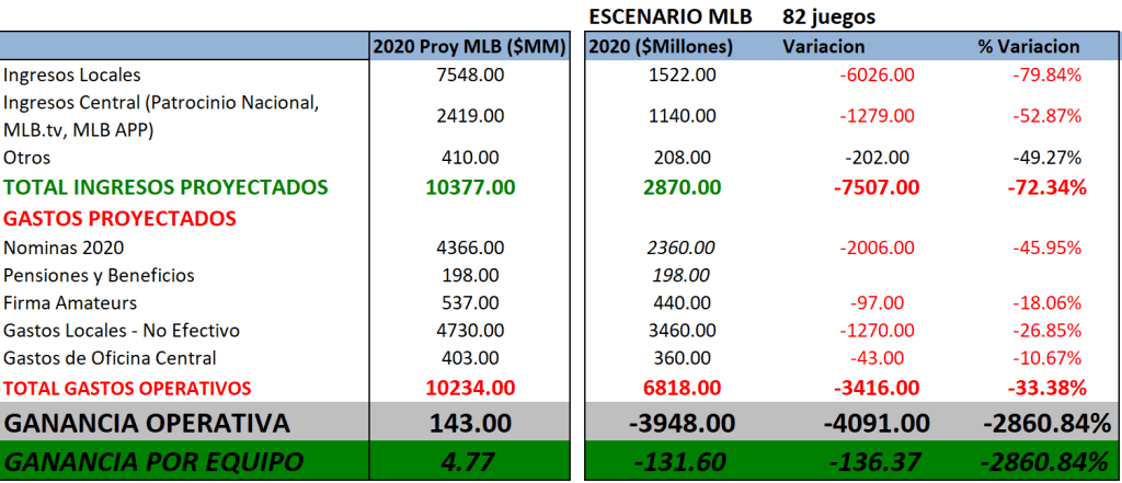 El Balance proyectado para 2020 en condiciones normales, según este estudio de MLB, muestra a la liga con una ganancia operativa antes de intereses, impuestos, depreciación y amortización de $143 millones de dólares, mientras que en un escenario de 82 juegos, con salarios prorrateados y sin público, indica pérdidas totales de $3.9 Billones.