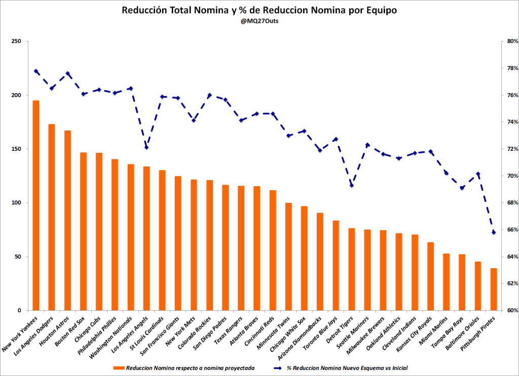 Desde el punto de vista económico, la propuesta buscaba, entre otras cosas, beneficiar a los equipos con mayores nóminas proyectadas en 2020 y, como hemos argumentado, aparentemente más afectados por esta situación. Los Yankees hubiesen tenido una reducción aproximada de su pesada nómina de casi $200 millones (78%) pues cuentan con 11 peloteros con salarios superiores a los 10 millones de dólares (42% de su nómina), incluyendo los salarios de Stanton (30 millones) y el recién adquirido Gerrit Cole (36 millones); en cuanto que Pittsburgh apenas la reduciría unos $40 millones, 33% respecto al prorrateado, pues más del 60% de su nómina recibiría menos de $1 millón de dólares.