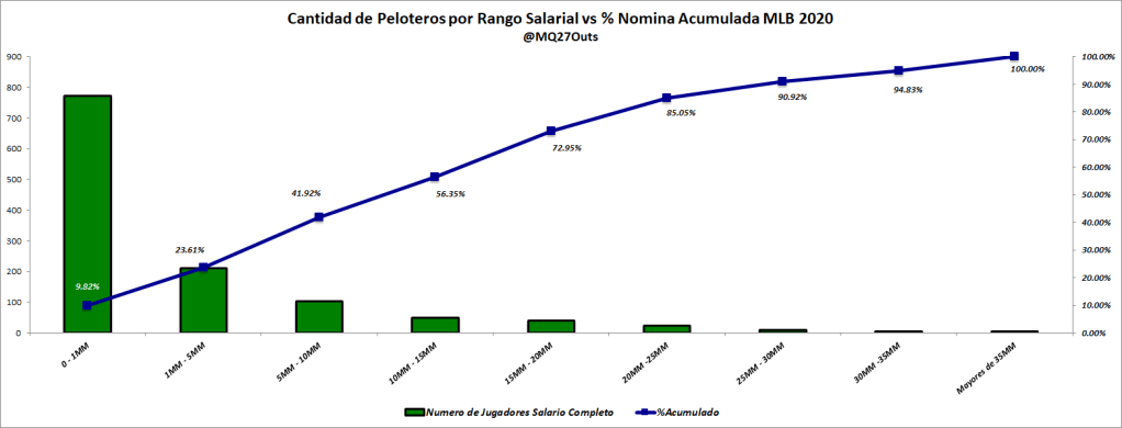 El siguiente histograma muestra que casi 800 peloteros de los 1200 proyectados a iniciar la temporada 2020, tienen salarios menores o iguales a $1 millón de dólares y que la suma de sus salarios representa apenas un 10% del total de las nóminas, mientras que apenas 241 peloteros (aproximadamente 20%) tienen salarios anuales superiores a los $5 millones pero su ocupación en la nomina es superior al 80%. Al aplicar la reducción sobre estos 240 jugadores, la liga cumple su objetivo de reducir los salarios hasta casi un 70% respecto al inicial sin tener que rebajar notablemente los salarios de aquellos de menor renta.