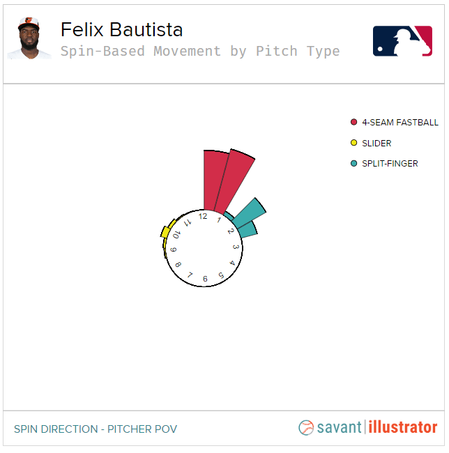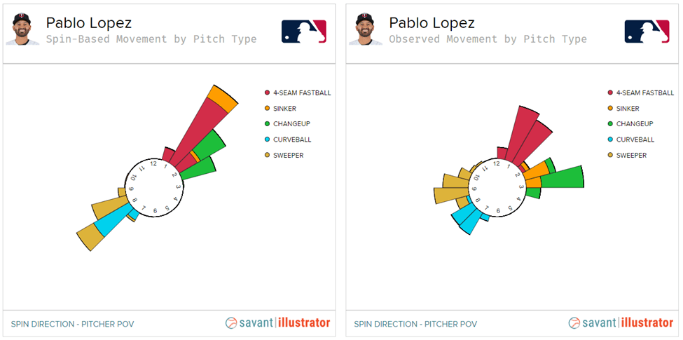 Por ejemplo, Pablo suelta en un ¾, desde una altura en pies de 5.52, bien por debajo del promedio de la liga de 5.8. En cambio, Felix Bautista lanza totalmente por arriba del brazo desde una altura de 7.0 pies. Aunque por orientación del brazo, Lopez debería soltar cerca de las 1:30 o 2:00, con la inclinación de su muñeca hace que en promedio suelte a la 1:00, como si fuese un lanzamiento soltado bien cerca de su cabeza. Por otro lado, Bautista al lanzar de esa forma tiene una dirección de 12:00 con spin rate de 2400 y eficiencia del 98%, eso le permite generar un movimiento vertical absurdo de 20.4 pulgadas, el más alto de toda la liga.