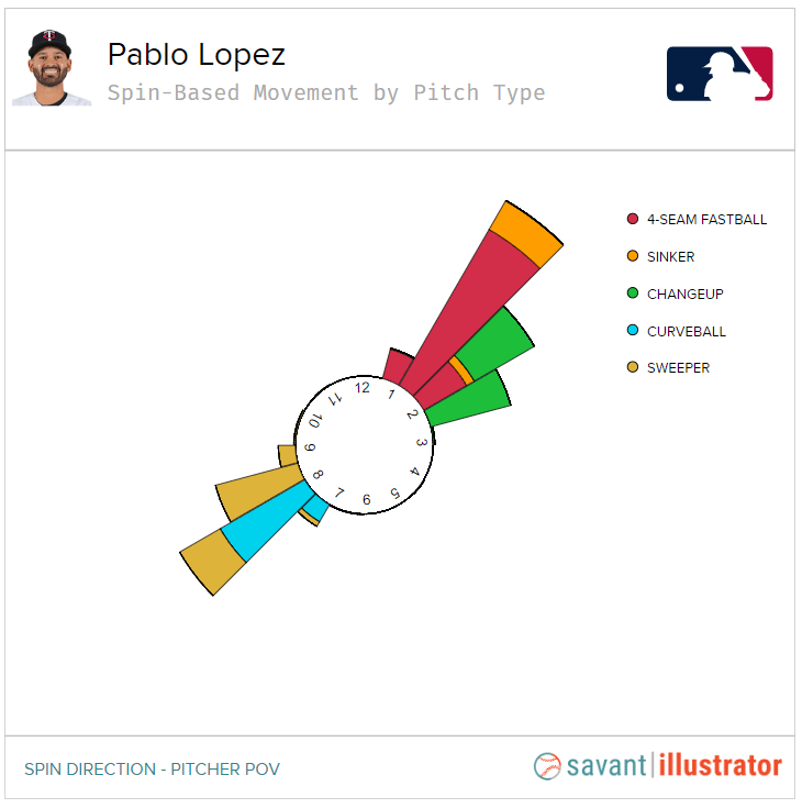 Pablo Lopez consigue también este efecto con su Sinker (y también con su cambio y su nueva slider). La recta y el sinker salen a la 1:00, la recta termina a las 12:45, el sinker a las 2:15. Esto da una idea del por qué sus rectas pueden ser tan efectivas a pesar de su bajo spin rate y spin efficiency.