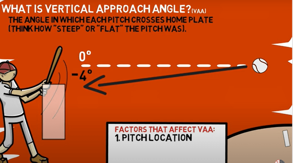 El VAA es el ángulo al cual el pitcheo cruza el plato, es decir, qué tan “plano” o “inclinado” es el lanzamiento cuando se acerca al home plate.