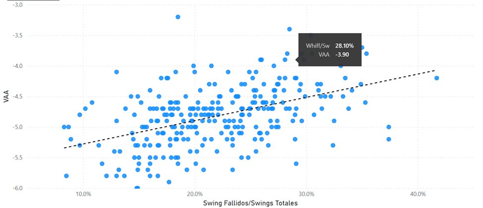 La gráfica muestra que existe una correlación entre el VAA de la recta y el porcentaje de swings que terminan siendo fallados por los bateadores (a menor VAA, mayor whiff%). Los valores que se muestran son los de Joe Ryan.