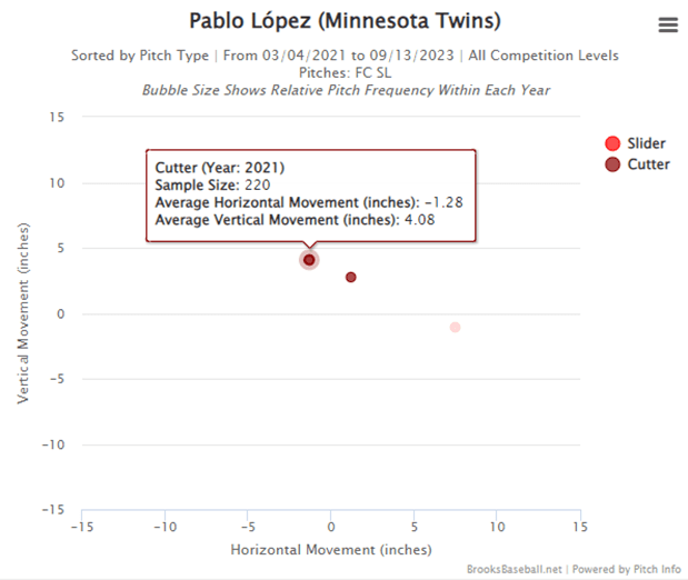 La slider es su nuevo juguete, uno que desarrolló apenas la pasada temporada muerta al llegar a los Twins y que viene a sustituir a su recta cortada que había tenido excelentes resultados en 2021 (.214 AVG, .333 SLG, 1 HR en 47 apariciones que terminaron con el lanzamiento) pero que en 2022 recibió tanto castigo (.333 AVG, .722 SLG, 4 HR en 54 apariciones) que tuvo que limitar su uso a menos del 6% para los dos últimos meses de campaña.
