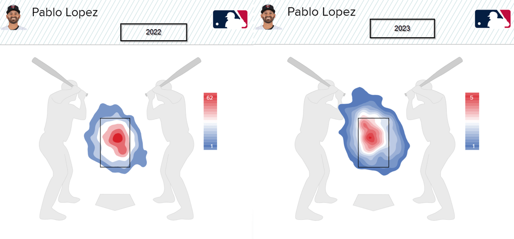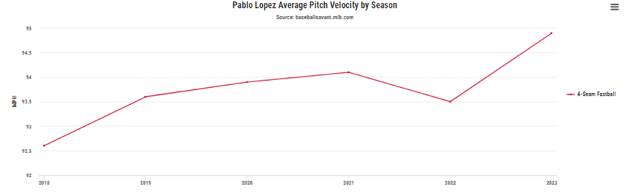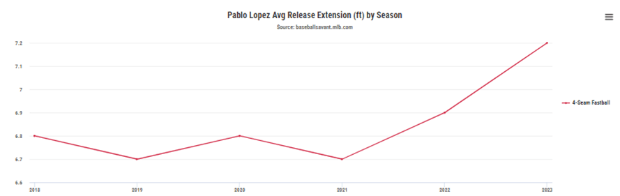Lopez llegó a la temporada lanzando su recta 1.5 Millas por hora más rápida que en 2022 y aumentando la extensión, o punto desde donde el lanzador suelta la bola respecto a la goma/placa del montículo (rubber) en 0.3 pies, pasando de 6.9 a 7.2.