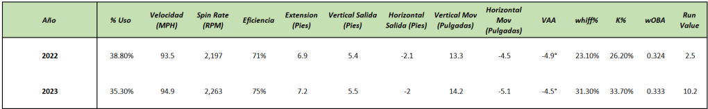 Su recta ganó una pulgada más de movimiento vertical inducido (13.3 en 2022 vs 14.2 en 2023) y 0.5 pulgadas de movimiento horizontal (4.5 en 2022 vs 5.1 en 2023). Entre otras cosas, debido al aumento en su velocidad que generó también su Spin Rate, aunque ligeramente, aumentara de 2197 RPM a 2263 RPM.