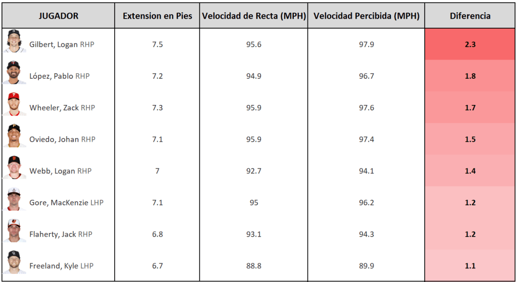 Estos son los 8 abridores calificados que añaden más velocidad a su recta sólo por la extensión de su zancada. López es 2do, detrás de Logan Gilbert, quien suelta la bola con una separación de 7.5 pies respecto a la placa del monticulo, precisamente la mayor diferencia entre iniciadores.
