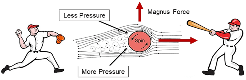 El Efecto Magnus en la recta hace que el pitcheo se oponga a la gravedad y se mantenga más tiempo en el aire. Cuando la pelota gira en backspin, empuja el aire que viene en dirección opuesta por detrás de la pelota y hacia abajo, creando mayor presión en la parte baja de la pelota y haciendo que esta se desplace hacia arriba (Fuerza Magnus), área de menor presión. A mayor tasa de Backspin mayor será el movimiento vertical. La siguiente imagen describe el fenómeno para una recta.